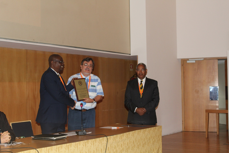 During CAG27 in Aveiro, Portugal, July 2018 – recognition plaque from GSAf. From left: Prof. Gbenga Okunlola (President of GSAf), Prof. Lopo Vasconcelos, Prof. Aberra Mogessie (Past president) |